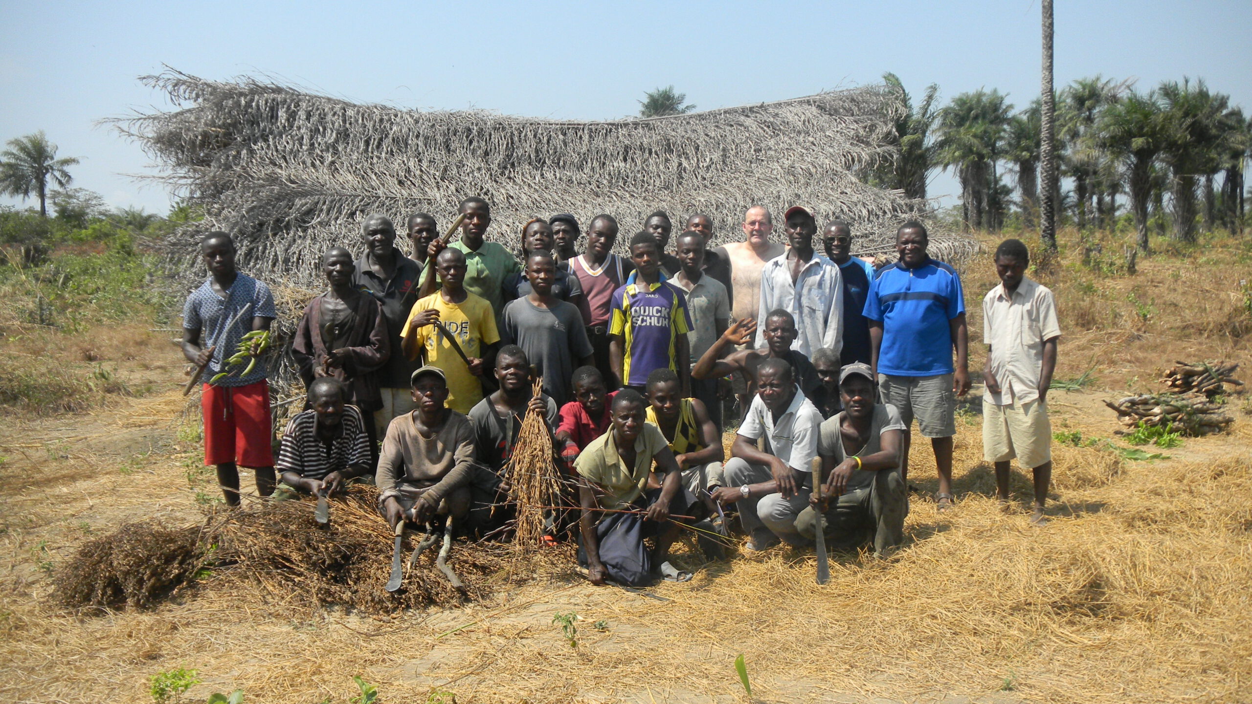 Het is zweten, als je 16 hectare grond moet ontdoen van struikgewas en palmbomen. Zeker als je alles met de hand moet doen bij 35 graden. En anderzijds vele handen maken licht(er) werk.